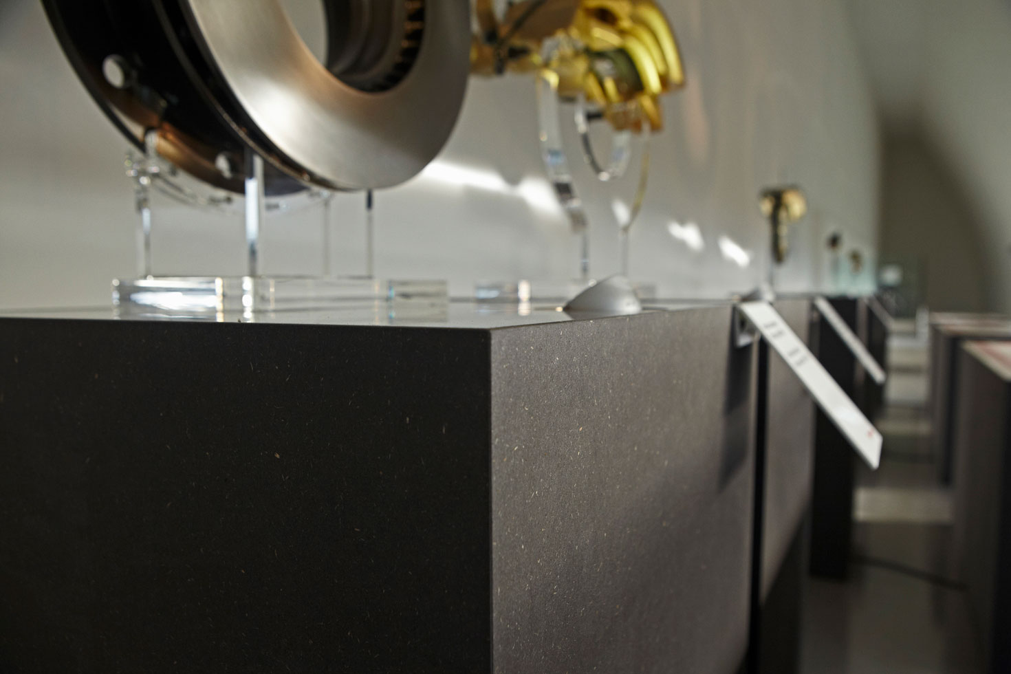 plexiglass supports placed on wooden bases with a soft-touch finish to narrate the history of this