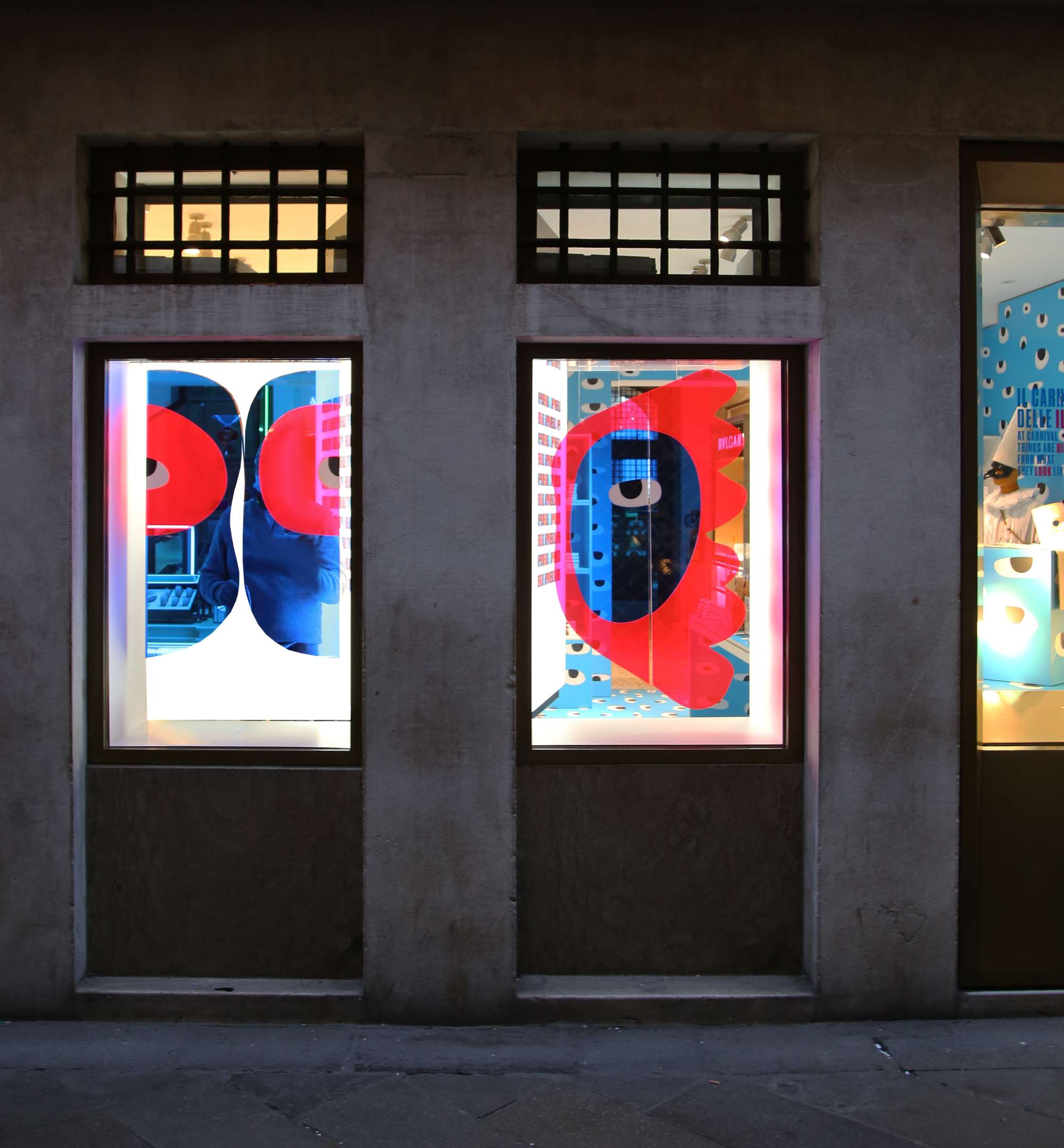 Una colorata collaborazione tra Studio Visuale ed Hangarfusina: dodici "Windows spaces" del prestigioso Fondaco dei Tedeschi, storico palazzo veneziano adiacente al Ponte di Rialto, allestite con colori ed effetti dinamici per il Carnevale 2022.