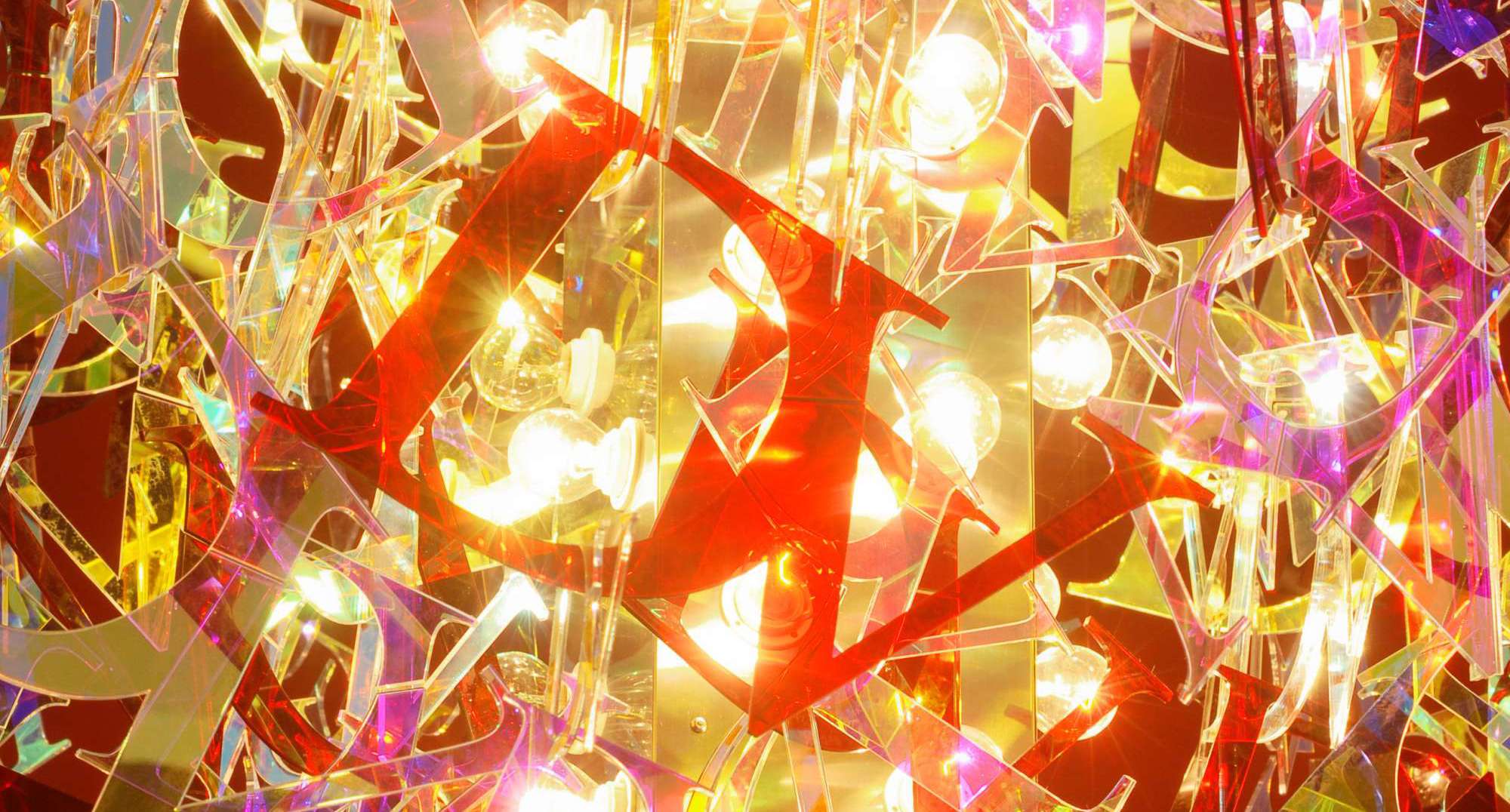 Un lampadario ottenuto duplicando il logo di Daveri in infinite variazioni di colore tramite l’utilizzo dell’effetto cangiante, per un luccichio attraente come i gioielli presentati dal brand.
